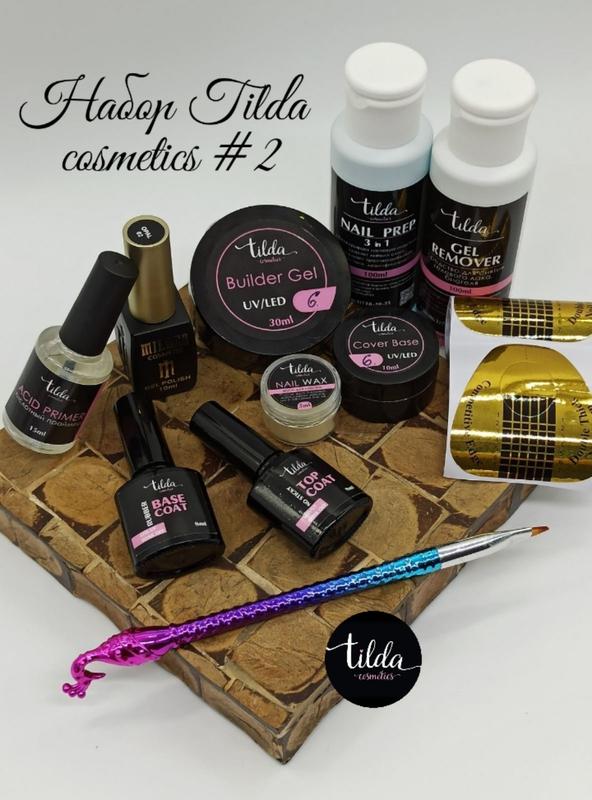 Набір Tilda cosmetics №2 Ціна набору 1075 грн. У набір входить: 1. NAIL PREP 3 in 1 Tilda cosmetics 100 мл 2. Gel Polish Remover Tilda cosmetics 100 мл (Рідина для зняття гель-лаку) 3. Топ без липкого шару (no sticky) Tilda cosmetics 8 мл 4. База каучукова (rubber base) Tilda cosmetics 8 5 мл. Primer Tilda cosmetics (кислотний/безкислотний праймер на ваш вибір) 6. Cover Base Tilda Cosmetics 10 мл (на ваш вибір, крім 1 кімнати!) 7. Гель для нарощування Tilda cosmetics 30 мл (на ваш вибір) 8. Бальзам/віск Tilda cosmetics для нігтів (на ваш вибір) 9. Гель лак Milano Opal 1шт. (на ваш вибір) 10. Форми золото для нарощування 50 шт. 11. Кісточка для гелю 1 шт.