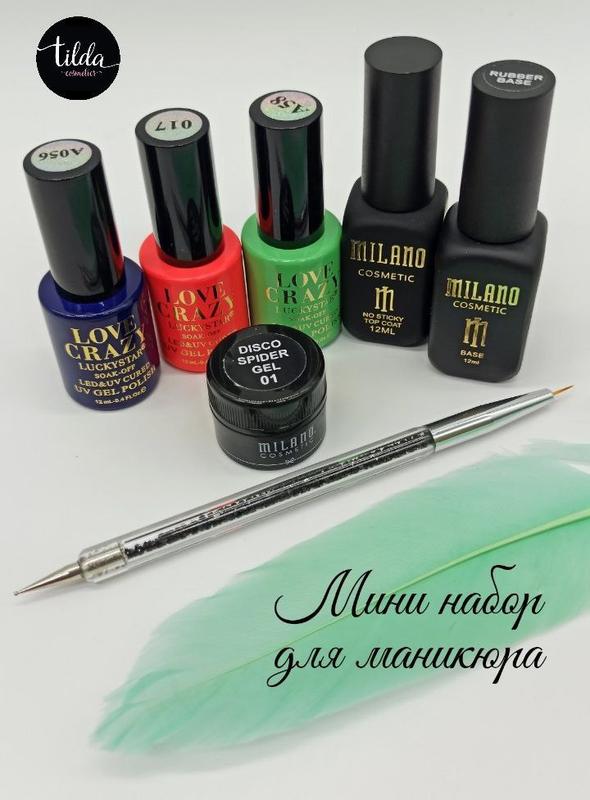 Міні набір для манікюру (мн012) Ціна набору 599 грн У набір входить: 1. Каучукова база Milano 12 мл 2. Топ Milano 12 мл (без липкого шару/з липким шаром на вибір) 3. Гель-лаки Love Crazy 12 мл 3 шт (на вибір) 4. Світловідбивний гель-павутинка Milano (Spider Gel Effulgence) 6 мл. (Колір на вибір) 5. Пензлик для дизайну нігтів 1 шт.