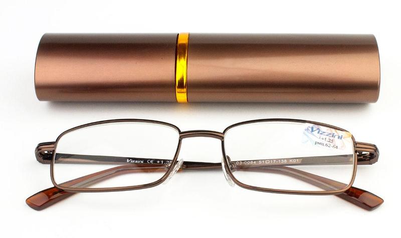 Стильні та якісні готові окуляри у пластикових та металевих оправах від виробника Vizzini стануть чудовою прикрасою для жінок та чоловіків. Особливість готових діоптрійних окулярів полягає в тому, що діоптрій на обидва ока однакові і відстань між центрами стандартна 62-64 мм. Футляр в комплекті від +0,75 до +4,00 крок 0,25