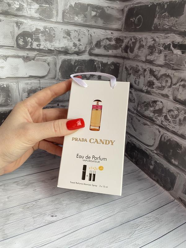Жіночий міні парфум Prada Candy - це карамельна насолода. ✅Тип аромату: гурманський, східний. ✅Початкова нота: карамель, ✅Нота серця: пудрова нота, мускус, ✅Кінцева нота: ваніль. 3*15 мл