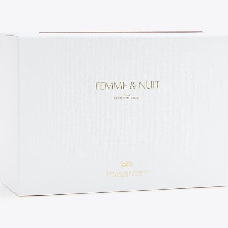 Склад: Набір містить два флакони об'ємом по 90 мл кожен. Опис ароматів: Femme: Квітковий аромат, що відкривається нотами франжипані, півонії та легким відтінком бергамоту. У серці відчуваються пудрові ноти орхідеї та геліотропа, які переходять у вершкову базу з ванілі, бобів тонка та білого мускусу. Nuit: Теплий, затишний та інтенсивний аромат. Він розкривається фруктовими нотами бергамоту та персика, за якими слідує елегантний букет з ірису та конвалії.