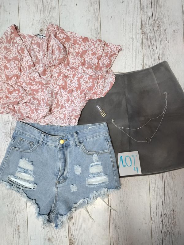 Лот 4, кількість 5 шт: 1. Топ-блуза Savage Honey. 2. Сіра плюшева спідниця. 3. Джинсові шорти Shein. 4. Чокер (біжутерія). 5. Пробник парфумів Attar Collection Khaltat Night Доставка Укрпоштою, Новою поштою та Міст експрес. Оплата на карту, при отриманні або безпечною оплатою. Якщо є додаткові питання - пишіть!