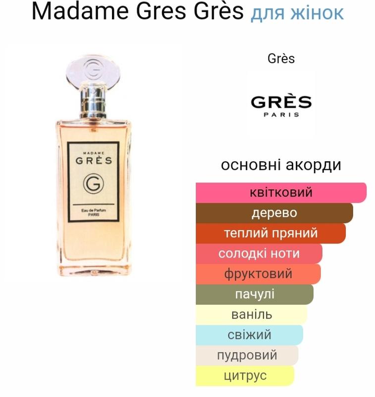 Gres Madame – сладкий восточно-цветочный аромат с фруктовым стартом и теплой ванильно-древесной базой. Ноты: старт: ананас, грейпфрут, кардамон сердце: фрезия, магнолия, пион база: ваниль, кожа, сандал, пачули Состояние: без коробки, использовано буквально несколько распылений