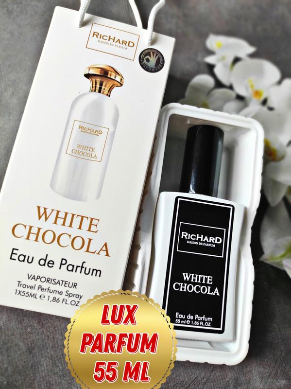 White Chocola Richard — это аромат для мужчин и женщин, он принадлежит к группе восточные гурманские. Верхние ноты: Мандарин и Мускатный орех; средние ноты: Белый шоколад и Ваниль; базовые ноты: Цветок миндаля, Цвет персика, Цветок вишни и Мимоза. очень эффектный и (на мой взгляд) очень женский парфюм. А еще пример гурманики высокого класса, которая при этом не будет делать из Вас откровенное лакомство, какой-нибудь пирог или модный нынче капкейк. Одевая White Chocola Вы просто остаетесь без шансов быть незаметной. Его шлейф поражает своим размахом, при этом оставаясь совершенно безопасным для самой хозяйки. Очень красивый, гурманский, цитрусово-орехово-пудровый старт, но немного с кислинкой. Потом раскрывается нежное какао масло, с большой порцией нативного ванилина и белых цветов с миндальным обертоном