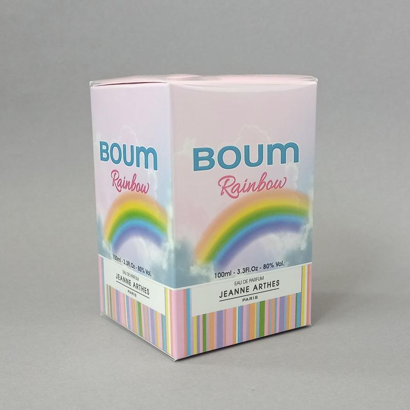 Бренд: Jeanne Arthes Назва аромату: Jeanne Arthes Boum Rainbow Палітра нот: Верхні ноти: Диня та Грейпфрут; середні ноти: Кавун і Цикламен; базові ноти: Ваніль і Мускус. Батьківщина бренда: Франція Характер аромату: Фруктові квіткові Об'єм: 100 мл Випускається з 2023 року Тип аромату: Парфумована вода Для жінок