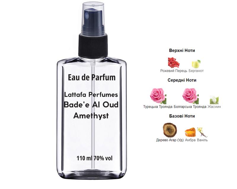 Унісекс аромат Lattafa Bade'e Al Oud Amethyst 110 мл Стать: унісекс Класифікація: мас маркет Тип аромату: гурманські, східні Початкова нота: Бергамот, Рожевий перець Нота серця: Болгарська троянда, Жасмин, Турецька троянда Кінцева нота: Амбра, Ваніль, Уд