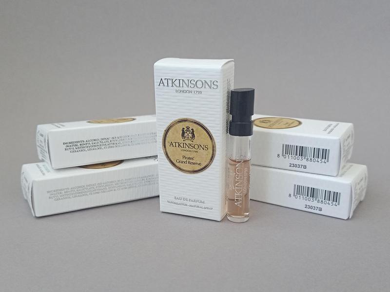 Бренд: Atkinsons Mint & Tonic (Аткінсонс) Назва аромату: Atkinsons Pirates' Grand Reserve Палітра нот: Верхні ноти — Геліотроп, Жасмин, Ром. Ноти серця — Герань, Какао, Кедр. Ноти основи — Мадагаскарська ваніль, Пачулі. Батьківщина бренда: Англія Характер аромату: Пряні східні Об'єм: 2 мл Випускається з 2017 року Тип аромату: Пробник парфумованої води Унісекс