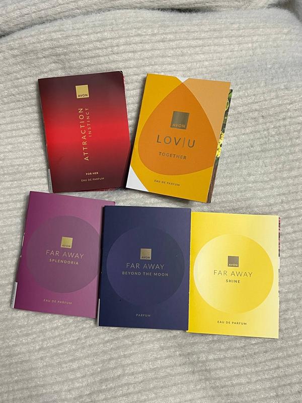 Набір з 5 пробних зразків жіночіх ароматів від Avon: -Attraction instinct (парфумована вода) -LOV|U together (парфумована вода) -Far away shine (парфумована вода) -Far away beyond the moon (парфум,духи) -Far away splendoria (парфумована вода) Об'єм кожного 0.6 мл Ціна за всі 5 штук Продаж набором,окремо не продаються Також маємо інші пробні зразки Avon,та продукцію цієї марки,дивіться наші оголошення