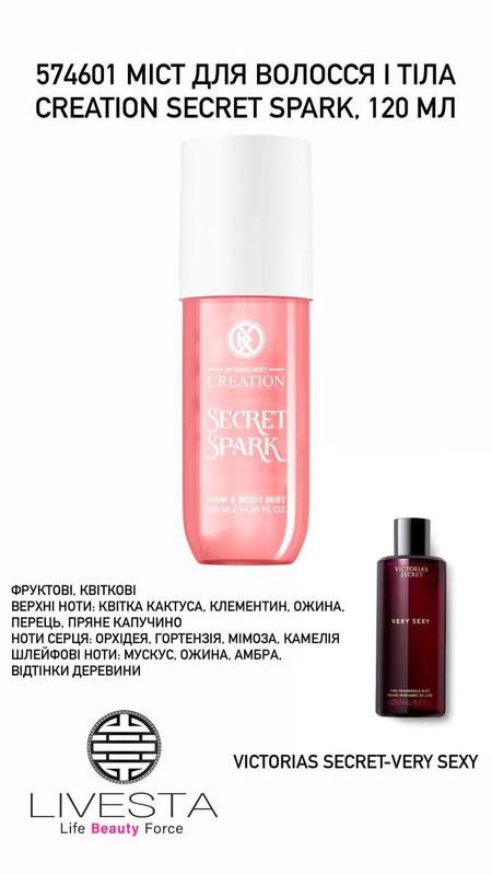 Група ароматів: фруктові, квіткові Верхні ноти: квітка кактуса, клементин, ожина, перець, пряне капучино Ноти серця: орхідея, гортензія, мімоза, камелія Шлейфові ноти: мускус, ожина, амбра, відтінки деревини Серія парфумованих містів CREATION - це аромати, які не тиснуть, а звучать легко та стильно. Свіжі й ненав’язливі, вони лягають м’якою вуаллю на ваше волосся та тіло, інтригують та запам’ятовуються. Ідеальні для моментів, коли хочеться пахнути ніжно, але незабутньо. Secret Spark - це більше, ніж просто міст. Це ароматна магія, яка випромінює відчуття життєвої сили і огортає вас тонким шлейфом квіткової свіжості та теплої чуттєвості завдяки деревним ноткам. Легка формула спрею дбайливо освіжає як волосся, так і шкіру, при цьому не подразнює і не пересушує, а навпаки надає м’якості та доглянутого вигляду. Міст Secret Spark стане справжнім запашним підписом жінки, яка прагне створити свій власний фірмовий аромат, що залишатиме по собі невидиме, але сильне враження. Кожне розпилення дарує не лише стійкий запах, а й заряд впевненості та задоволення на весь день. Завжди доречний і завжди особливий аромат Secret Spark чудово підходить для щоденного використання, як для ранкових ритуалів, так і перед виходом на вулицю. Нежирна текстура швидко поглинається, не залишаючи жирних чи липких слідів. Практичний об'єм 120 мл ідеально підходить для носіння в сумочці та використання у дорозі. Для всіх типів волосся та шкіри. Продукт не містить шкідливих для здоров‘я речовин. Застосування Для зовнішнього використання розпилити міст на волосся та тіло з відстані приблизно 15 см, тримаючи флакон вертикально, після чого дозволити аромату оточити вас вабливим шармом, який супроводжуватиме вас весь день. Розпилювати міст на чисту шкіру після прийняття душу або ванни. Використовувати за потреби. Застереження Зберігати в прохолодному місці подалі від дітей. Уникати нагрівання вище 50° С та впливу прямих сонячних променів.