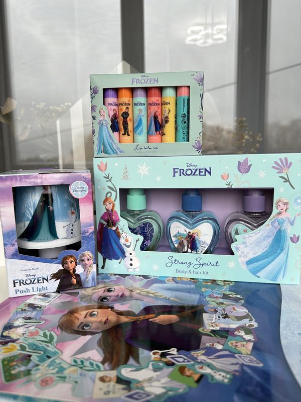 Дитячий подарунковий набір з улюбленими героями мультфільма «Крижане серце» Входить: -Набір спреїв для тіла та волосся*3 -Набір бальзамів для губ*6 -Нічник на батарейках -Великий збірник наліпок 1000+ На 2-му фото весь наявний товар в тематиці Frozen, можна підібрати набір на будь-який смак