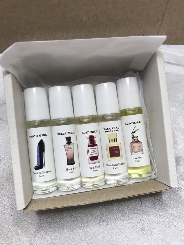 Набір з 5 масляних парфумів по 10 мл. В набір входять: Carolina Herrera Good Girl 10ml Mary Kay Bella Belara 10ml Tom Ford Lost Cherry 10ml Maison Francis Kurkdjian Baccarat Roughe540 -10ml. Gaultier Scandal 10ml.