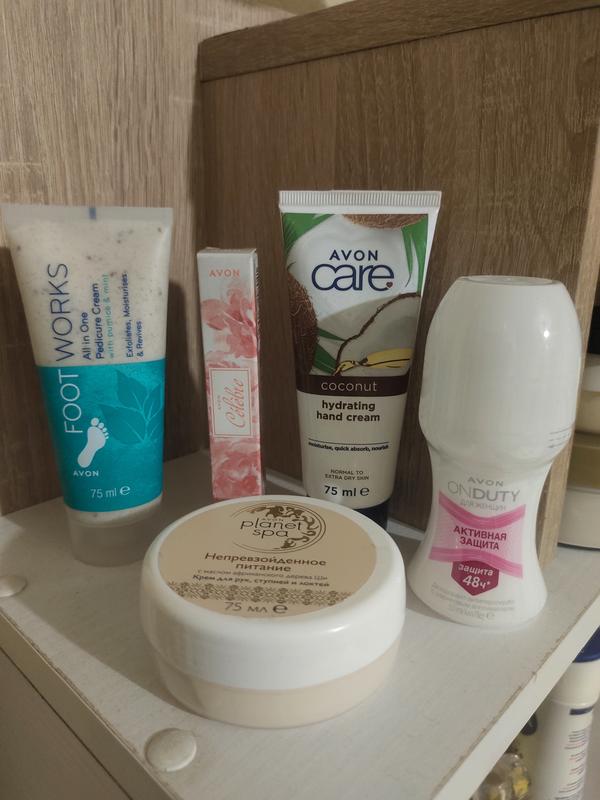 Набір містить: 1. Відновлювальний крем для рук з олією кокоса. 2. Дезодорант-антиперспірант з кульковим аплікатором "Активний захист" для жінок. 3. Крем для рук, стоп та ліктів з маслом африканського дерева ши "Неперевершене живлення". 4. Туалетна вода Celebre, 10 мл. 5. Крем для педикюру "Все в одному" з пемзою і м'ятою.