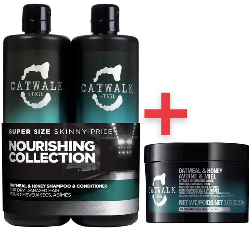 TIGI Catwalk Oatmeal & Honey Shampoo & Conditioner Набор шампунь і кондиціонер дует, який відновлює хімічно обробленого або пошкодженого волосся. Сформульовані з вітаміном А, В, Е, мед і білок пшениці, цей дует допомагає живити й ремонт, залишаючи волосся м'яким і шовковистим. Натуральна поживна маска рясно насичена вітаміном Е, який глибоко живить коріння волосся, відновлюючи його пошкоджену структуру та м'яко піклуючись про здоров'я волосяних цибулин. Ваше волосся знову сяє силою і здоров'ям, повертаючи свою пружну еластичність і гладкість. Забудьте про постійну плутанину сухого та пошкодженого волосся. Шовковисте, доглянуте волосся — це реальність, створена позаду природи та наполегливою працею найкращих французьких експертів краси Tigi.