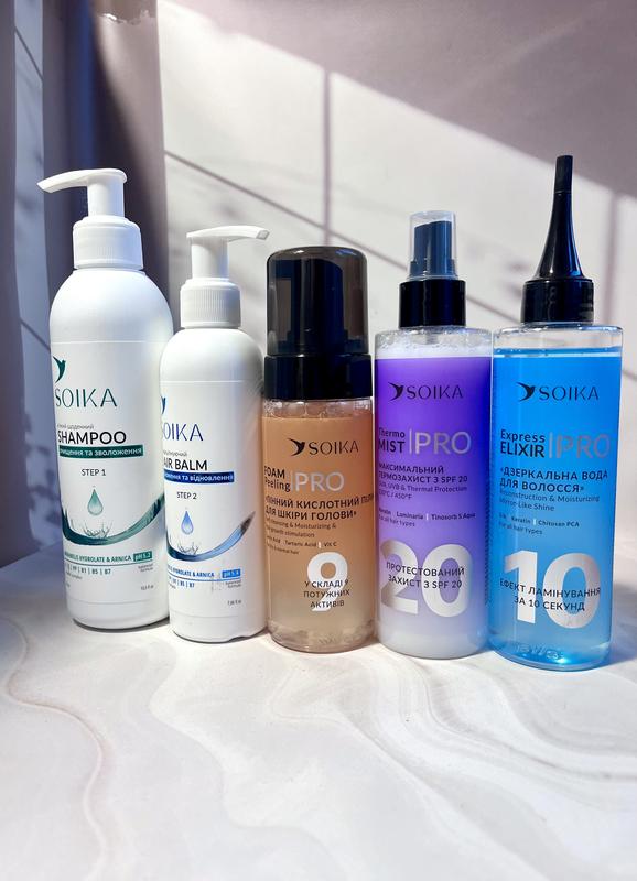 Набір від бренду SOIKA наситить волосся живильними компонентами і якісно очистить шкіру голови. Після застосування цього набору ви насолоджуватиметесь чудовим виглядом гладенького, зволоженого і сяючого волосся. Склад набору: 1) М'який шампунь (300 мл) Шампунь з гідролатами гамамелісу, арніки й вітамінами для всіх типів волосся. Завдяки нейтральному рівню pH 5,2 ( pH шкіри людини 5,5) шампунь делікатно очищує шкіру голови та волосся, не пошкоджуючи захисний шар шкіри та не травмуючи волосся. 2) Кондиціонуючий бальзам (200 мл) Кондиціонуючий бальзам SOIKA з гідролатами гаммамелісу, арніки й вітамінами. Вітамінний комплекс з гідролатами гамамелісу та арніки активно відновлює та зволожує волосся. Позбавляє від тьмяності, сухості, надмірної пухнастості й перешкоджає появі посічених кінчиків. 3) Молочний кислотний пілінг для сухої та нормальної шкіри голови (150 мл). Має пом'якшувальні властивості, які допомагають зменшити лущення шкіри та позбавитися від сухості. Регулює роботу сальних залоз, зменшуючи вироблення себуму і попереджає появу жирного блиску на волоссі. 3) Дзеркальна вода для волосся реконструкція та зволоження. (200 мл Express Elixir PRO для волосся зміцнення та об`єм. Миттєво потрапляє та вбудовується в структуру волосся, створюючи безумовну гладкість та сяяння без обтяження. 4) Soika Спрей-термозахист "Термо Міст" для волосся, (200 мл) Thermo Mist PRO забезпечить максимальний захист для волосся з SPF 20.