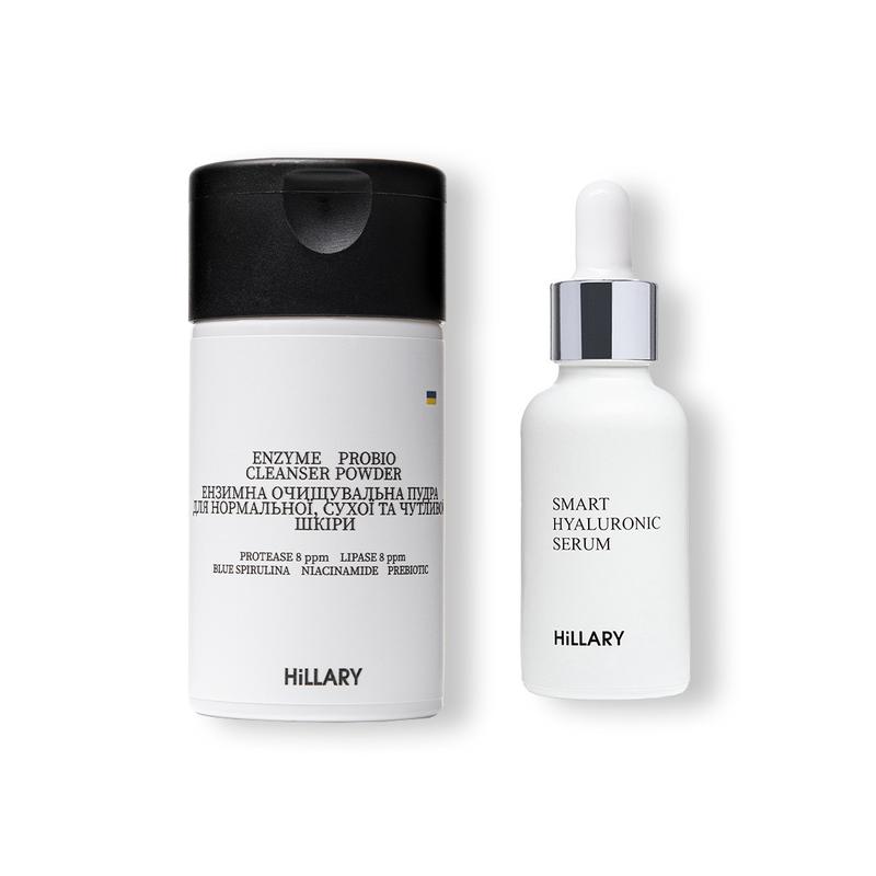 Набір Ензимне очищення та зволоження для сухої та нормальної шкіри для ніжного та водночас ретельного очищення шкіри та підготовки її до подальшого догляду. Ензимна пудра якісно та глибоко очищає шкіру від забруднень, видаляє відмерлі клітини завдяки дії 2 типів ензимів рослинного походження - PROTEASE та LIPASE. Містить органічний пребіотик для балансу мікробіому шкіри та ніацинамід для відновлення та зволоження. А гіалуронова сироватка зволожує глибокі шари шкіри, попереджає старіння і відроджує молодість шкіри, відновлює і захищає, утримує вологу всередині шкіри, помітно скорочує зморшки, підтягує шкіру і надає їй сяйва. Під час масажу, властивості гіалуронової сироватки значно підсилюються. До набору входять: - Ензимна очищувальна пудра для нормальної, сухої та чутливої шкіри Hillary Enzyme Probio Cleanser Powder, 40 г - Гіалуронова сироватка Hillary Smart Hyaluronic, 30 мл Спосіб застосування: 1. Після очищення шкіри нанесіть половину чайної ложки пудри на вологі руки та розітріть до утворення кремової пінки. Нанесіть на наявності круговими рухами, унікаючі зони навколо очей. Злегка помасажуйте 1-2 хвилини, потім ретельно змийте теплою водою. Використовуйте пудру 1-2 рази на тиждень. 2. Рівномірно нанесіть масажними рухами невелику кількість сироватки Smart на чисту, вологу шкіру обличчя, шию і зону декольте.