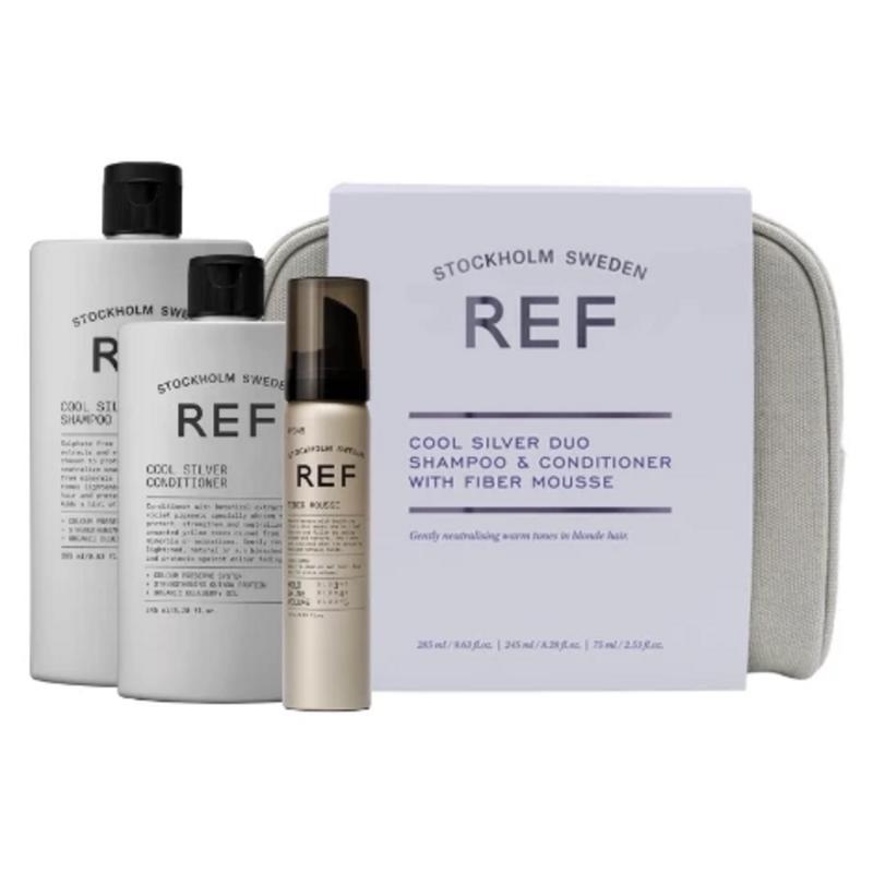 Склад набору: - Шампунь REF Cool Silver Shampoo 285 мл - Кондиціонер REF Cool Silver Conditioner 245 мл - Мус Fiber Mousse N°345 75 мл Beauty Bag Cool Silver — це набір доглядових засобів, створений спеціально для світлого фарбованого або сивого волосся. У наборі є безсульфатний шампунь і кондиціонер із фіолетовими пігментами, що усувають небажані жовті відтінки, спричинені окисненням або мінеральними речовинами. Обидва засоби дбайливо тонізують натуральні світлі, освітлені або вибілене сонцем волосся й захищають від вицвітання та вимивання кольору. Доповнює дует мус для стайлінгу, який дарує укладці гарний обсяг, а також зручна косметичка, що дає змогу брати необхідні засоби із собою в подорож або зберігати їх в одному місці. Спосіб застосування: Нанесіть на вологе волосся, спініть і змийте. Потім використовуйте кондиціонер. Після миття шампунем нанесіть кондиціонер на волосся й залиште на хвилину. Ретельно змийте. Потім розподіліть невелику кількість мусу в долонях, нанесіть на вологе волосся і висушіть феном для створення додаткового об'єму.