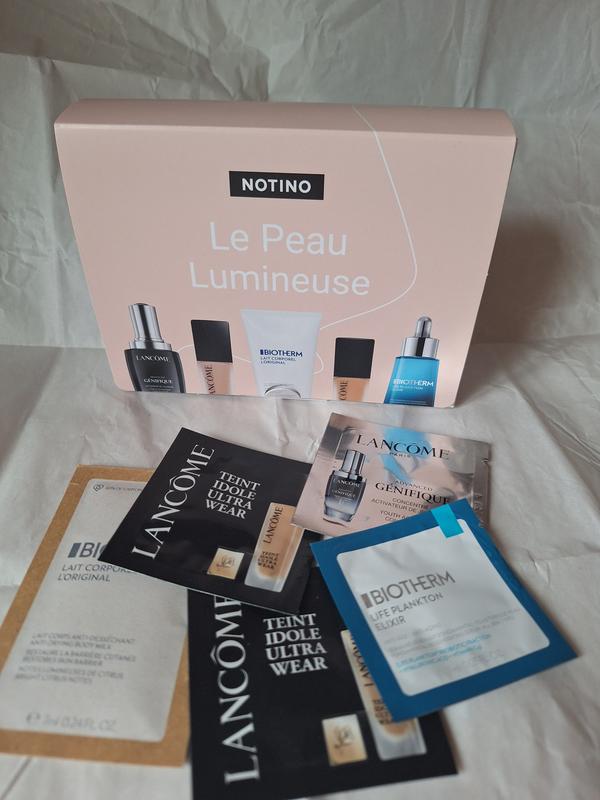 В набір входить Lancome Teint Idole Ultra Wear 325C+220C кремовий коректор + Biotherm Lait Corporel L'Original Body Milk молочко для тіла для чутливої шкіри + Lancome Génifique Serum омолоджуюча сироватка + Lancome Life Plankton Elixir захисна відновлююча сироватка