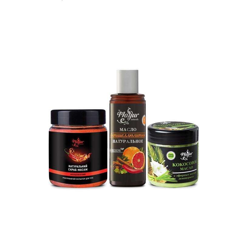 Антицелюлітний догляд, ТМ Mayur Натуральний антицелюлітний скраб для тіла, TM "Mayur" 250 мл Розігрів натуральний скраб з імбиром і перцем для боротьби з целюлітом. Дрібні часточки пемзи м'яко вирівнюють мікрорельєф шкіри, а олії мигдалю й органічний екстракт коксу зволожують, насичують вітамінами та запобігають в'ялості. Ефірна олія імбиру прискорює обмін речовин, виводить надлишкову рідину з організму та токсини, сприяє загоєнню ран. Ефірна олія апельсина покращує пружність шкіри, запобігає розтяжкам, проявам целюліту, знімає м'язову та нервову напругу. Бадьорий цитрусовий аромат скрабу надає заряду оптимізму. * Органічний сертифікат ** COSMOS/ECOCERT натуральний сертифікат *** З натуральних компонентів Олія антицелюлітна, 120 мл Комплекс натуральних олій мають антицелюлітні властивості, які ефективно доглядають за шкірою. Олія ягід годжі — природний антиоксидант, виводить токсини, олія жожоба перешкоджає виникненню розтяжок. Олія зеленої кави й екстракт стручкового перцю посилюють кровообіг і сприяють розщепленню підшкірного жиру. Олія ягід годжі в складі містить ненасичені жирні кислоти, що пришвидшують і нормалізують метаболізм. Олія є природним антиоксидантом, виводить токсини, завдяки чому схуднення проходить ефективніше. Олія жожоба містить мононенасичені жирні кислоти, що перешкоджають виникненню розтяжок. Олія зеленої кави й екстракт стручкового перцю посилюють кровообіг і сприяють розщепленню підшкірного жиру. Ефірні олії грейпфрута, чорного перцю та кориці тонізують і посилюють регенерацію шкірних покривів. * Органічний сертифікат ** COSMOS/ECOCERT натуральний сертифікат *** З натуральних компонентів Кокосова олія з ефірною олією лемонграсу TM «Mayur» Олія додасть вашій шкірі легкого аромату свіжого лемонграсу, зробить її ніжною та здоровою. Ефірна олія лемонграсу додасть сил і допоможе сконцентруватися. Засіб контролює жирність шкіри, тонізує її та зменшує зморшки, має антисептичну дію. Повністю натуральний склад продукту зміцнить шкіру природними вітамінами й антиоксидантами. * З натуральних компонентів