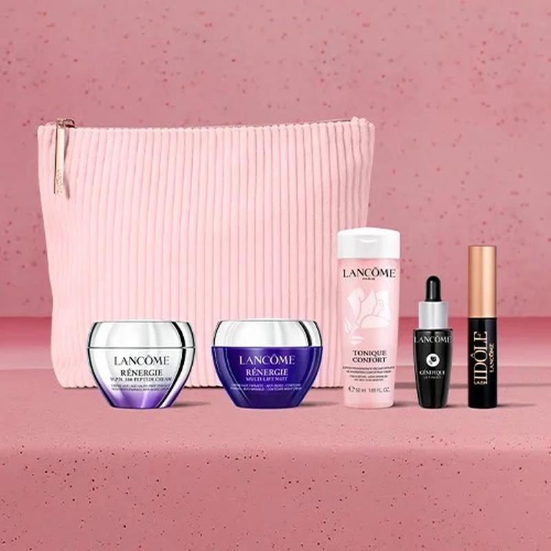 Подарунковий набір Rénergie з 6 предметів у рожевому мішечку .У комплект входить крем Rénergie HPN 300-peptides (15 мл), нічний крем Rénergie Lift Multi-Action Night (15 мл), тонік Tonique Confort (50 мл), сироватка Génifique Ultimate (10 мл), туш Mini Lash Idôle Mascara та косметичка Відправка Новою поштою, Укрпоштою