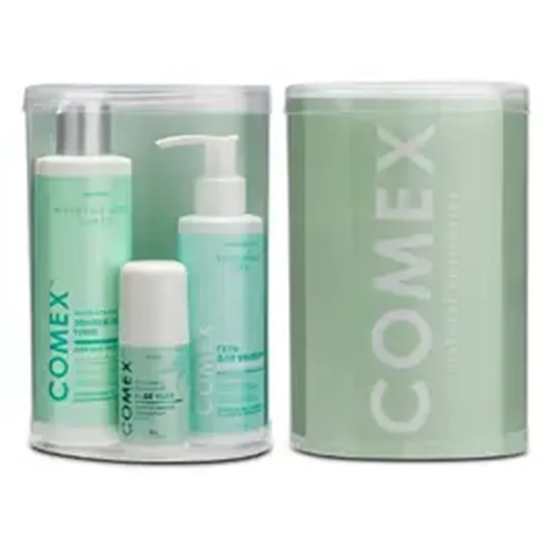 Подарунковий набір для обличчя й тіла "Алое вера та гіалуронова кислота", TM Comex Натуральний гель для вмивання для жирної та комбінованої шкіри ТМ "Comeх" 150 мл Натуральний гель для вмивання на основі аюрведичних рецептів з екстрактами евкаліпта, органічного кокоса та індійських рослин. Позбавляє зайвої жирності та акне, м'яко очищує, матує, регулює вироблення шкірного жиру. Підходить для чутливої та проблемної шкіри, ефективно знімає макіяж. Тонік зволожуючий для всіх типів шкіри з ретинолом та гіалуроновой кислотою натуральний ТМ Comex 250 мл Засіб для догляду за шкірою обличчя з натуральних та органічних компонентів, що очищує, тонізує, вирівнює колір шкіри та покращує її структуру. Комплекс гіалуронової та молочної кислоти інтенсивно зволожує, підтримує гідробаланс, знімає подразнення, сприяє еластичності. Ретинол надає шкірі пружності та попереджає появі зморшок. Евкаліпт освіжає, має бактерицидний та загоювальний ефекти, сприяє регенерації нових клітин епідермісу. Екстракти індійських трав живлять вітамінами, дбають про свіжий колір та сяйво шкірі. Дезодорант натуральний "Алое вера", TM "Comex" Природний антисептик алуніт контролює виділення поту та запобігає появі неприємного запаху, не закупорює пори, не залишає слідів на одязі. Екстракти алое вера, органічного кокосу, рослинний гліцерин заспокоюють та освіжають шкіру. Натуральний склад дезодоранту дарує здоров`я та чистоту, а терпкувато-свіжі акорди Алое Вера зроблять день неповторним. Характеристики Основні Виробник Сяйво Класифікація косметичного засобу Органічна Інформація для замовлення