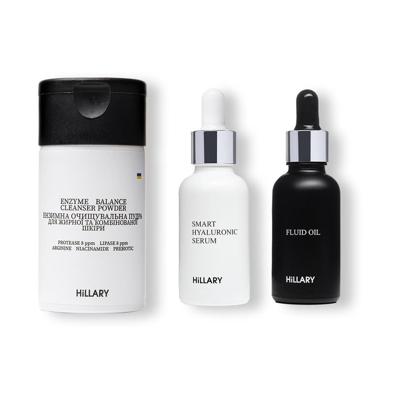 Набір Ензимне очищення та зволоження для жирної та комбінованої шкіри для ніжного та водночас ретельного очищення шкіри та підготовки її до подальшого догляду. Ензимна пудра якісно та глибоко очищає шкіру від забруднень, видаляє відмерлі клітини завдяки дії 2 типів ензимів рослинного походження - PROTEASE та LIPASE. Містить органічний пребіотик для балансу мікробіому шкіри та ніацинамід для відновлення та зволоження. Гіалуронова сироватка зволожує глибокі шари шкіри, попереджає старіння і відроджує молодість шкіри, відновлює і захищає, утримує вологу всередині шкіри, помітно скорочує зморшки, підтягує шкіру і надає їй сяйва. Під час масажу, властивості гіалуронової сироватки значно підсилюються. А олійний флюїд звужує пори і робить зморшки менш помітними. Так досягається ефект гладенької шкіри і рівного тону, тому макіяж лягає ідеально і довше виглядає свіжим. Дає потужний захист від сонця і вільних радикалів. До набору входять: - Ензимна очищувальна пудра для жирної та комбінованої шкіри HiLLARY Enzyme Balance Cleanser Powder , 40 г - Гіалуронова сироватка Hillary Smart Hyaluronic, 30 мл - Олійний флюїд для обличчя Hillary FLUID OIL, 30 мл Спосіб застосування: 1. Після очищення шкіри нанесіть половину чайної ложки пудри на вологі руки та розітріть до утворення кремової пінки. Нанесіть на наявності круговими рухами, унікаючі зони навколо очей. Злегка помасажуйте 1-2 хвилини, потім ретельно змийте теплою водою. Використовуйте пудру 1-2 рази на тиждень. 2. Змішайте в долоні дві краплі олії з двома кроплями-сироватки і нанесіть масажними рухами на чисту, вологу шкіру обличчя, шию і зону декольте.