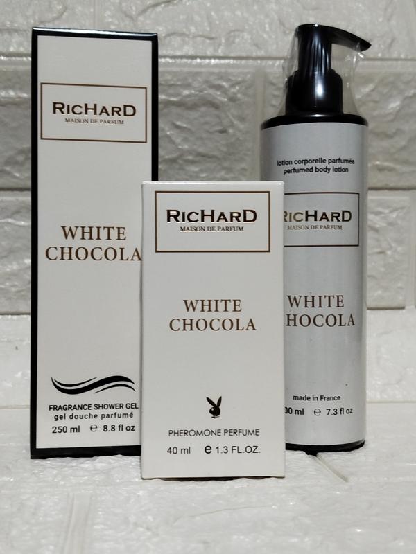 Набір складається з парфумованого гелю для душу, парфумів та парфумованого лосьйону для тіла. White Chocola Richard - для жінок та чоловіків, він належить до групи східні гурманські. Верхні ноти: Мандарин та Мускатний горіх; середні ноти: Білий шоколад та Ваніль; базові ноти: Квітка мигдалю, Колір персика, Квітка вишні та Мімоза.