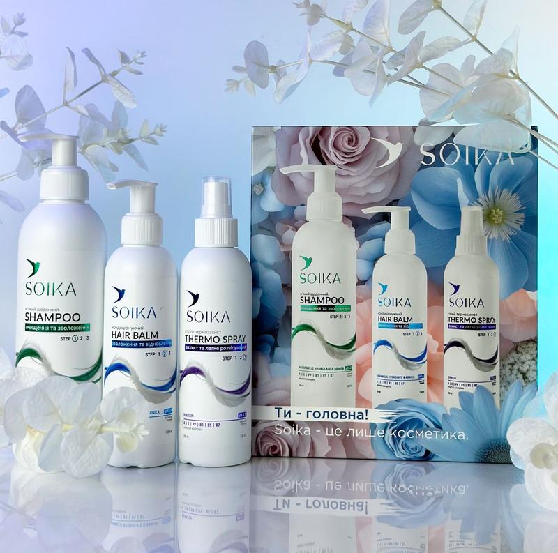Подарочный набор для волос «очищение и увлажнение» soika 3 в 1 (шампунь, бальзам, термозащ...