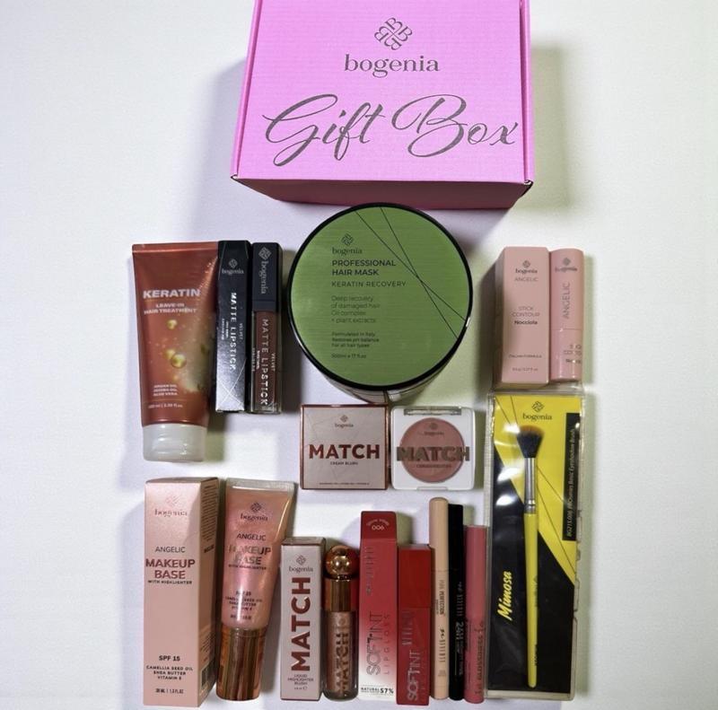 Склад набору: 1. Маска для волосся "Кератинове відновлення" Bogenia, 500 мл 2. Незмивний бальзам для волосся Keratin Leave-in Hair Treatment Bogenia, BG417 3. База під макіяж з хайлайтером Bogenia Angelic, BG612 4. Пензлик для макіяжу PROseries Bogenia, BG215 5. Рідкі рум'яна MATCH Liquid Highlighter Blush Bogenia, BG635 6. Рум'яна Bogenia Angelic Creamy Blush Stick, BG632 7. Кремові рум'яна MATCH Cream Blush Bogenia, BG634 8. Консилер-олівець Pure Perfection NEVERTI NP103 9. Підводка-маркер NEVERTI 24H, NP104 10. Блиск для губ Soft Tint Lipgloss NEVERTI NP802 11. Помада-бальзам для губ Bogenia Glossiness Lipstick Balm, BG750 12. Рідка матова помада для губ Bogenia, BG720
