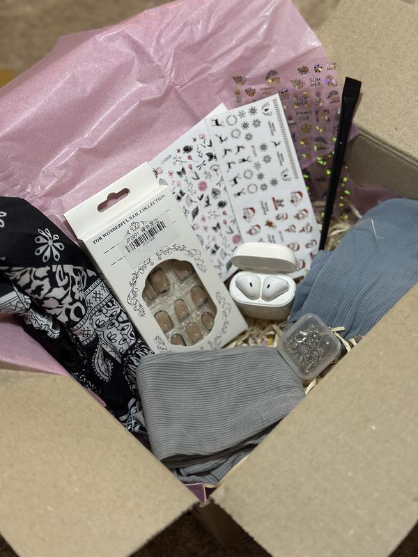 До складу боксика входить: - безпровідні навушники - 2 пари шкарпеток - цепочка - накладні нігті - 3 наклейок для нігтів - пензлик для макіяжу - повʼязка на голову