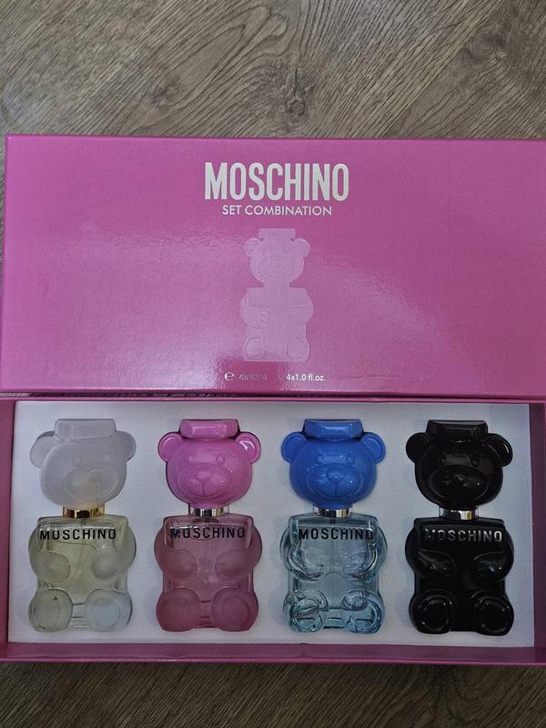 Це набір, що пахне грою, стилем і дизайнерською сміливістю. Moschino Toy -- це аромати в унікальних флаконах-ведмедиках, кожен зі своїм настроєм: ніжний, яскравий, свіжий або глибокий. У наборі -- чотири флакони по 30 мл: білий, рожевий, синій та чорний. Це подарунок для тих, хто любить нестандартний стиль і колекційні аромати.