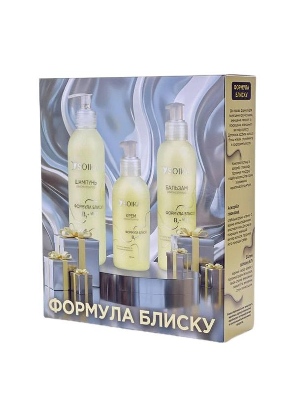 Подарунковий набір 3 в 1 SOIKA "Формула блиску" призначений для догляду за сухим, ламким і посіченим волоссям. У складі цього косметичного набору передбачені: шампунь-реконструктор -- 340 мл, бальзам-реконструктор -- 200 мл, крем-реконструктор для кінчиків волосся -- 150 мл. Особливості продукту: - Шампунь-реконструктор характеризується легкою текстурою, яка м'яко та дбайливо видаляє забруднення й надлишки себуму. Засіб зберігає природний баланс шкіри голови, робить волосся слухняним і свіжим. - Бальзам-реконструктор інтенсивно зволожує локони, зменшує ламкість волосся, полегшує розчісування. Засіб згладжує волосся, робить волокна еластичними, гладкими та приємними на дотик. - Крем-реконструктор захищає локони від ламкості, запобігає появі посічених кінчиків. Засіб чудово зменшує пухнастість локонів, надаючи волоссю природний блиск і гладкість. Активні компоненти лінійки "Формула блиску": - Біотин (вітамін B7) ефективно зміцнює структуру волосся, зменшує ламкість і сприяє збереженню м'якості. - Аскорбіл глюкозид (вітамін C) є потужним антиоксидантом, захищає локони від негативного впливу довкілля та підтримує сяйво волосся.