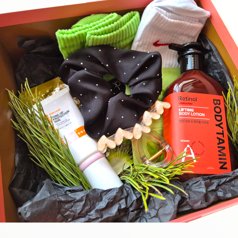 1. Носки 36-40 (зелені, білі). Можуть бути іншим кольором, 2 шт. 2. Дві маски від SADOER (авокадо, м'ята), є інші види. 3. Резинка з камінчиками чорна. Є в наявності біла та коричнева. 4. Крабик для волосся 1 шт. 5. Лосьйон для ліфтингу всього тіла (Південна Корея) 300 мл. 6. Сонцезахисний крем, який підлаштовується під шкіру, 50 мл. ( П. Корея) 7. Красива коробка (є на вибір).