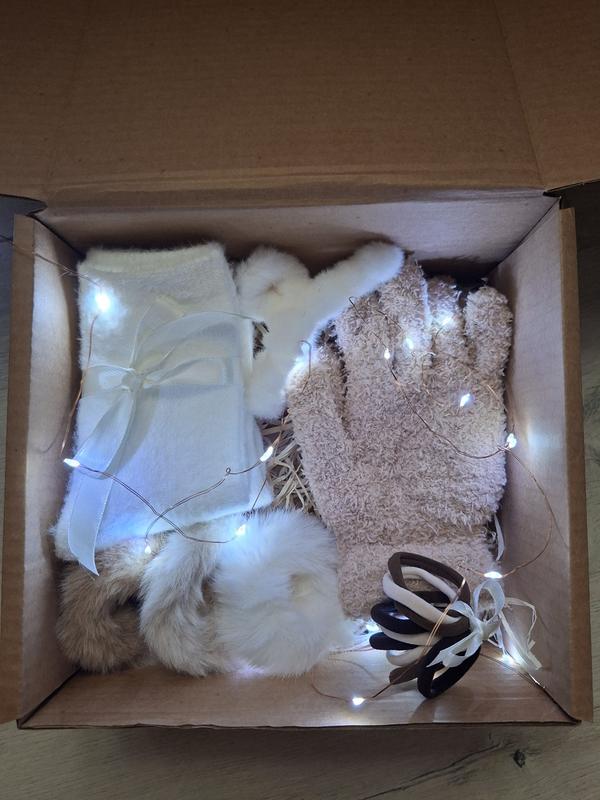 Прекрасний подарунковий набір, в який входить: - приємні на дотик носочки 1 шт. - тепленькі рукавички "Тедді" 1 шт. - пухнасті резинки для волосся 3 шт. - заколка для волосся 1 шт. - мікс тонких резинок для волосся 10 шт. - міцна крафт коробка 1 шт. Гірлянда в даний набір не входить. За Вашим бажанням можемо змінити наповнення та кольорову гамму боксу. Маємо великий вибір затишного домашнього одягу, прикрас та аксесуарів. Направлю фото та відео огляд. Відправка в день замовлення! Всіх з наступаючими святами!