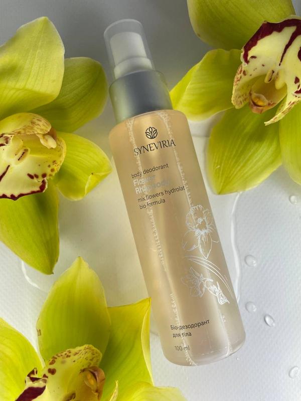 Біо дезодорант Flower Rhapsody від SYNEVIRIA – це інноваційний безпечний засіб, призначений для щоденного догляду за шкірою рук, ніг, тіла та пахвових і пахвинних западин. Засіб здійснює контроль над пітливістю протягом 12-ти годин, не порушує природної терморегуляції, не містить шкідливих компонентів, парабенів тощо. - усуває неприємний запах, а й причину його утворення; - заспокоює і охолоджує шкіру, надає їй відчуття природної свіжості; - не містить спирт та інші токсичні сполуки; - не закупорює пори; - не залишає плям на шкірі і одязі; - містить натуральні екстракти та колоїдне срібло; - чинить антисептичну дію; - підходить для будь-якого типу шкіри. Ключові компоненти: гідролат алое, гідролат ромашки, гідрогенізована касторова олія, гліцерин, колоїдне срібло (іони срібла), екстракти: листя чайного дерева, алое вера, квітів ромашки, гінгко білоба, лаванди. Гідролат алое в складі засобу усуває подразнення шкіри, діє як антисептик. Гідролат ромашки заспокоює та регенерує шкіру, зволожує та тонізує, має бактерицидні властивості, покращує роботу сальних залоз . Колоїдне срібло чинить додаткову антисептичну дію. Основну дезодоруючу дію чинять галуни алюмокалієві у складі біо-дезодоранту в поєднанні з комплексом натуральних екстрактів. Галуни також мають дезінфекційну дію, знижують активність потових і сальних залоз. В алюмокалієвих галунах відсутні токсини та алергени, завдяки чому вони легко переносяться абсолютно всіма. Комплекс 5-ти екстрактів (ромашка, гінгко білоба, лаванда, листя чайного дерева та алое) - живить шкіру та насичує її корисними елементами. Парфумерна композиція: Верхні ноти – чорна орхідея, дамаська троянда, жасмин. Базові ноти: голуба орхідея, фіалка, нарцис, лаванда. Нижні ноти: сандал, мускус, бамбук.