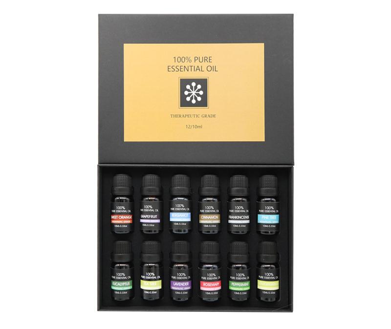 Набір натуральних ефірних олій, 12 ароматів по 10 мл у коробці - для аромаламп, масажу, ва...