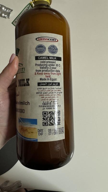 Верблюже молоко надзвичайно поживне. Воно наповнено імунними білками, жирними кислотами, вітамінами та мінералами, такими як: Омега жирні кислоти 3, 6 і 9: будівельні блоки здорових клітинних мембран; вони створюють природний жировий бар’єр, зберігаючи шкіру зволоженою Натуральні альфа-гідроксикислоти: ніжне відлущування нашої шкіри від мертвих клітин Вітаміни та мінерали: висока концентрація вітамінів A, B, C, D і E міститься у верблюжому молоці. Вони мають відновлювальні властивості, підтримуючи природне омолодження шкіри Імунні протеїни: високі концентрації унікальних протизапальних білків, що підтримують імунітет Фосфоліпіди: природні молекули, які притягують воду та утримують її. Як результат, фосфоліпіди є вирішальним компонентом для підтримки зволоженості шкіри. Привезений з Єгипту !!! 1 літр