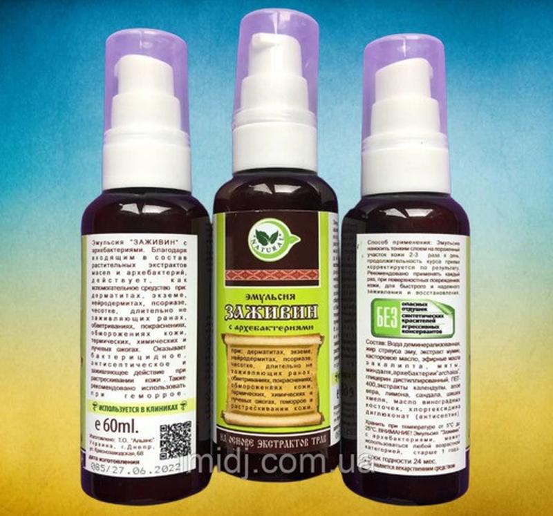 Эмульсия Заживин - антисептическое средство которое оказывает заживляющее, противовоспалительное, противоотечное, смягчающее и увлажняющее действие. Рекомендуется к применению при: дерматитах, экземе, нейродермитах, псориазе, чесотке, долго не заживающих ранах, обветриваниях, покраснениях, обморожениях кожи, геморрое и растрескивании кожи. Состав: вода деминерализованная, экстракт мумиё, касторовое масло, эфирные масла эвкалипта, мяты, миндаля, архебактерии "агсhаios", глицерин дистиллированный, ПЕГ-400, экстракты календулы, алое, лимона, сандала, шишек хмеля, масло виноградных косточек, хлор гексидина диглюконат (антисептик). Способ применения: Эмульсию наносить тонким слоем на пораженный участок кожи 2-3 раза на день. Продолжительность курса приема корректируется по результату. Рекомендовано применять каждый раз, при поверхностных повреждениях кожи, для быстрого и надежного заживления и восстановления.