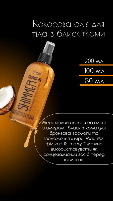 З НИМ ТИ ІДЕАЛЬНА🥰 Є в 3 об'ємах: 50мл.-140.💰 100мл-180.💰 200мл.-280💰 Шимер,який адаптується під твій тон шкіри та маскує недоліки.При цьому має захист від 🌞spf15. А аромат-це просто🔥. Бронзовий шимер йде на основі кокосової олії: 🟣зволожує 🟣захищає від сонячних променів 🟣надає тілу сяйво 🟣робить стрункішою, приховує целюліт 🟣приховує недоліки (зморшки,рубці,розтяжки) 🤔Нагадуємо,що шимер при температурі нижче 25+ градусів стає кремової консистенції-це особливість натуральної🥥 кокосової олії.Щоб шимер знов став рідкої текстури його треба поставити на сонечко або в теплу водичку.Перед використанням бутилку треба встряхнути,так як шимер осідає на дні .