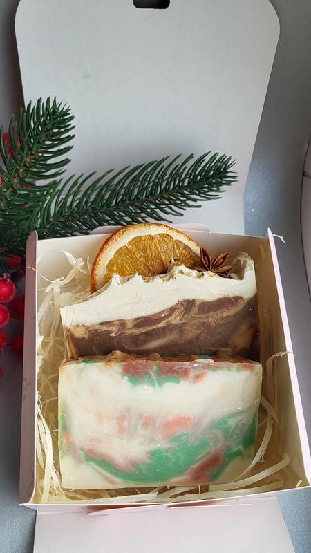 Натуральне мило – це маленька турбота про себе щодня. Воно дбайливо очищує шкіру, зберігаючи її м’якість і природний баланс. У кожному шматочку – тільки натуральні інгредієнти та легкий аромат природи. Простий спосіб додати щирості та тепла у ваші щоденні ритуали В наборі мило 2 сортів: 1. Натуральне мило Медове 🔸Склад: омилені олії кокосова, оливкова, рицинова, пальмова, авокадо, какао, ши, лужний розчин на деоанізованній воді, молочна кислота, цитрат натрію для запобігання прогоркання олій, мед, деоксид тітану (натуральний барвник), косметична міка американського виробництва, американська парфумована олія, декор дольки сушеного апельсину, бад'ян, кориця, гвоздика, глітер Запах : Різдвяний настрій • Верхні ноти: лимон, апельсин, грейпфрут, яблуко. • Середні ноти: гвоздика, кориця, кора касії, кардамон, імбир, морква, мускатний горіх. • Базові ноти: ваніль, клен, вершковий крем. 2. Натуральне мило Шовкове 🔸 Склад: омилені олії кокосова, оливкова, рицинова, солодкого мигдаля, пальмоіа, ши, лужний розчин на деоанізованній воді, кокони шовкопряда, молочна кислота, цитрат натрію, деоксид тітану (натуральний барвник), зелена та червона міка, американська парфумована олія Запах : Ельф • Верхні ноти: апельсин, лимон, газована вода. • Середні ноти: евкаліпт, м'ята, кориця, гвоздика. • Базові ноти: ваніль, мускус. 🔸Вага шматочкiв: ~100 г 🎁 Пакування у подарункову коробку Ціна: 270 грн