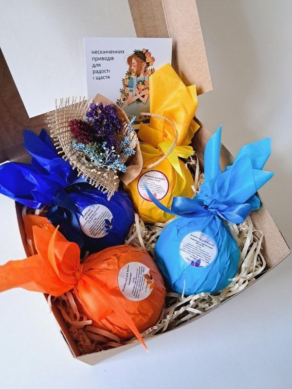 Это невероятный релакс и удовольствие! Бомбочки подарят вам хорошее настроение и крепкий сон. Ваша кожа будет нежной и мягкой, как шелк! Состав набора "4bombs": 1.Бело-синяя бомбочка 180 грамм; 2.Бело-голубая бомбочка 180 грамм; 3.Бело-желтая бомбочка 180 грамм; 4.Бело-оранжевая бомбочка 180 грамм. Бело-синяя бомбочка аромат лаванды с выразительной зеленой нотой, свежий. Смесь эфирных масел: лаванды, бергамота, шалфея мускатного и мяты. Обладает спазмолитическим, успокаивающим и антидепрессантным действием, снимает мышечные спазмы; снимает эмоциональные зажимы, укрепляет нервную систему, разглаживает и освежает кожу. Бело-голубая бомбочка. Аромат лаванды и цитрусовых фруктов. Очень органичный, лёгкий, спокойный, свежий аромат. Обладает тонизирующим действием, антицеллюлитным. Смягчает кожу, заживляет ранки, оказывает согревающее общеукрепляющее действие. Аромат способствует жизнерадостности и позитивному настрою Бело-оранжевая бомбочка: аромат апельсина. Обладает тонизирующим, дезодорирующим, регенерирующим, успокаивающим, противовоспалительным, антидепрессивным действием, способствует очищению организма от токсинов. Бело-желтая бомбочка, аромат Востока: пряный, смолистый, тёплый, насыщенный, со сладкими цветочными нотами. Способствует восстановлению упругости и эластичности кожи. Восстанавливает силы при сильном переутомлении и стрессе, оказывает общеукрепляющее и тонизирующее действие. Состав бомбочки: пищевая сода смягчает воду морская соль тонизирует кожу, заживляет небольшие язвы на коже. лимонная кислота отбеливает кожу, придавая ей сияющий вид. кукурузный крахмал подтягивает кожу, делает ее упругой сухое молоко делает кожу нежной и гладкой на ощупь миндальное масло делает кожу мягкой, бархатной и увлажненной, предотвращает сухость кожи, пищевой краситель подарит эстетическое удовольствие, а эфирные масла усилят действие этих ингредиентов Сделано в Украине