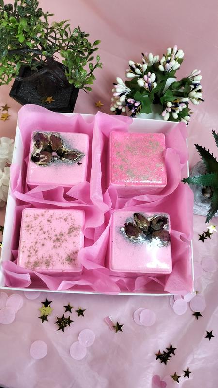 > Нежный набор бомбочек для ванны ручной работы с ароматом цветов и сладких нот. Идеально подходит для релакса, подарка любимому человеку или просто для себя. В наборе: 4 бомбочки в форме кубиков Каждая с сухоцветами, блеском и ароматическими маслами Упаковано в подарочную коробку с весельем