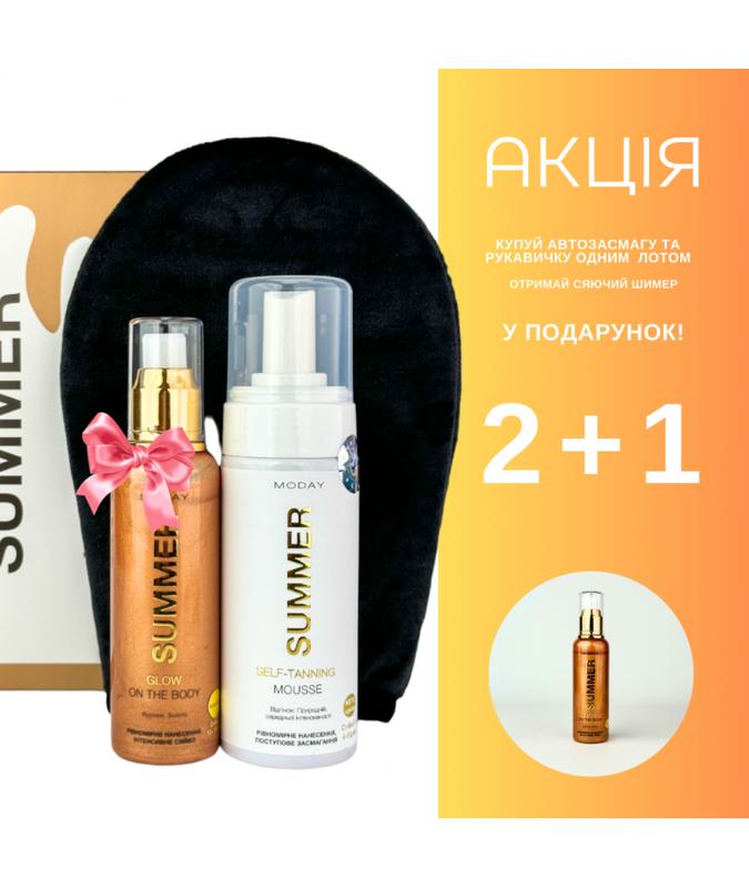 1. Мусс для автозагара Summer от MODAY - это безопасное загорание без негативного воздействия УФ лучей. Средство имеет уникальную формулу, которая позволяет быстро добиться желаемого оттенка кожи, а равномерное нанесение обеспечит естественный оттенок даже в зонах бикини, груди и декольте. Он имеет интегрированный механизм регулировки интенсивности загара, что позволяет вам самостоятельно контролировать глубину цвета кожи от легкого естественного загорания до более интенсивного оттенка. БЕЗОПАСНАЯ АЛЬТЕРНАТИВА Загара 5-6 часов - первое проявление оттенка 3-4 дня - стойкий выраженный результат Перед применением хорошо взболтайте средство, а также используйте специальную перчатку для нанесения мусса. ЧТО ЕСТЬ В НАШЕМ ЗАГРАНЕ, ЧЕГО ВЫ НЕ НАЙДЕТЕ У ДРУГИХ: Niacinamide - помогает равномерно распределить избыток пигмента в эпидермисе, не оставляя пятен на коже. Благодаря чему получается равномерный и хороший загар. Sodium Ascorbyl Phosphate - является стабильным производным витамина С. Обладает противовоспалительным эффектом и борется с бактериями, вызывающими акне. Предохраняет от повреждений, вызванных чрезмерным UV-облучением. Rubus Fruticosus (Blackberry) Fruit Extract - экстракт продов ежевики. Эффективно регулируют водный баланс кожи, тонизируют и повышают ее упругость. Borago Officinalis Extract - будет уменьшать все виды воспалений на коже, включая экзему, дерматит, псориаз и розацеа. Если вы просто ощущаете сухость, вам понравится его успокаивающее действие. 2. Перчатка GLOVE APPLICATION OF SELF-TANNING от MODAY - это специально разработанный аксессуар, который обеспечивает равномерное и безупречное нанесение автозагара на кожу. Этот аксессуар является незаменимым инструментом для достижения привлекательного и естественного вида загара. ПОДАРОК Шимер для тела концентрированный MODAY GLOW ON THE BODY с аллантоином, витамином Е и экстрактом борадо 100 мл