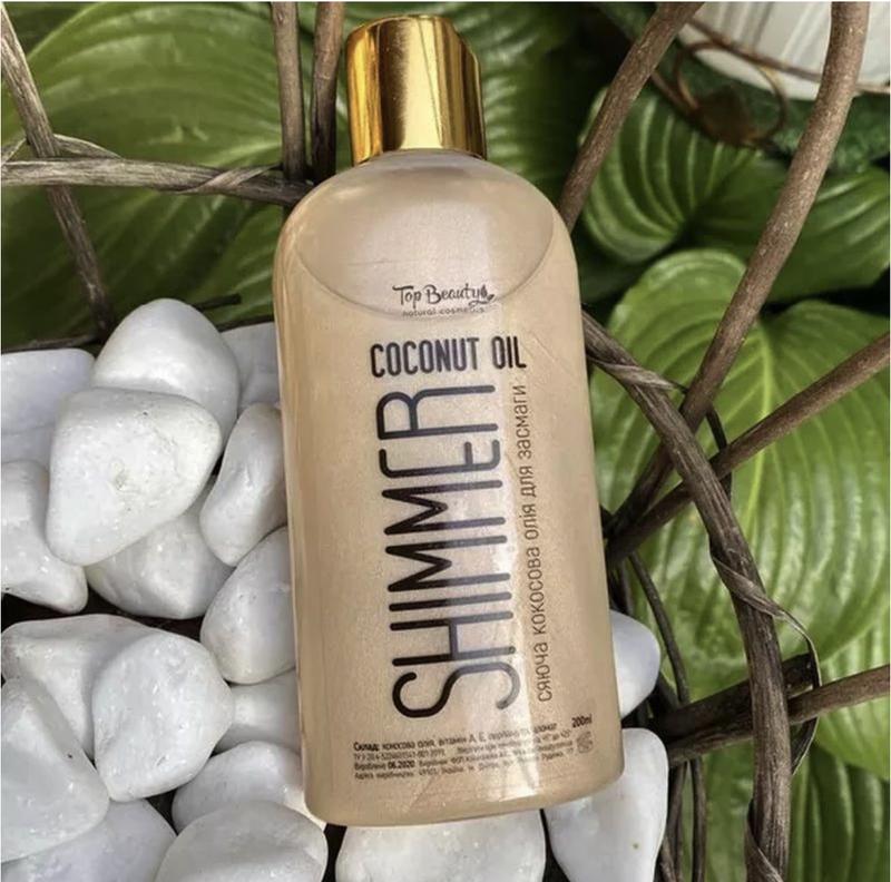 Увага! Масло приходить в замороженому вигляді. Для розморожування опустіть в гарячу воду або поставте на сонці. Супер мерехтливе кокосове маселко для бронзового загару і зволоження. З шиммером і блискітками для інтенсивної засмаги воно стане незамінним помічником у Вашій подорожі або відпочинку. Має УФ-фільтром 15, тому його можна використовувати в якості сонцезахисного засобу перед засмагою. Якщо шкіра дуже світла, краще доповнювати його спеціальними засобами з більш високим рівнем SPF-захисту, особливо це стосується світлошкірих людей . Регулярне нанесення кокосового масла перед виходом на вулицю дозволить вберегти шкіру від шкідливого впливу сонячних променів, але і посприяє її зволоженню і більш рівномірної засмаги. В складі також є інші цінні олії, які ще більше будуть дбайливо доглядати і зволожувати вашу шкіру, роблячи її гладкою і шовковистою, також захищаючи від передчасного старіння шкіри. Щоб результат був більш помітним, слід дотримуватися деяких правил: - його наносять тільки на очищену шкіру; - перед використанням олії можна прийняти ванну або душ з використанням м'якого скрабу для тіла; - після скрабу, потрібно обполоснути шкіру прохолодною водою, щоб пори звузилися і не накопичували сальні виділення; - на шкіру наносять чисте кокосове масло, розподіляючи його по тілу масажними рухами. Подібні процедури перед кожним виходом на сонце в жаркий час року захистить шкіру від неприємних наслідків сонячних ванн — почервоніння, лущення, дискомфорту.