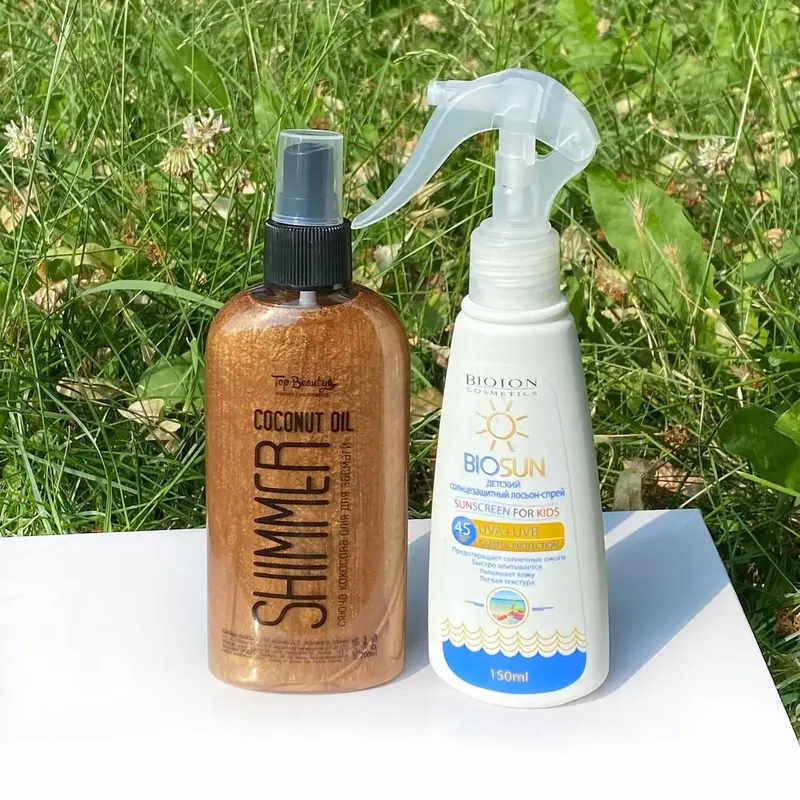 Універсальний набір для всієї родини! Він просто незамінний при активному відпочинку на сонці. Склад набору: 1. Дитячий сонцезахисний лосьйон-спрей BioSun розроблений спеціально для дитячої шкіри. Спрей володіє SPF 45, водостійкою формулою і фільтрами UVA і UVB. 2. Кокосова олія для засмаги з шиммером Top Beauty Shimmer Coconut Oil 200 мл. Шиммер - найпопулярніший продукт цього літа! Використовуючи його Ви придбаєте гарну рівну бронзову засмагу, мерехтливі частинки в складі подарують приголомшливе сяйво шкіри, і додадуть тілу стрункості. Має фактор захисту від УФ-випромінювання SPF 15 Ефект приголомшливий! Доставка: Предоплата на карту. Доставка Новою або Укрпоштою.