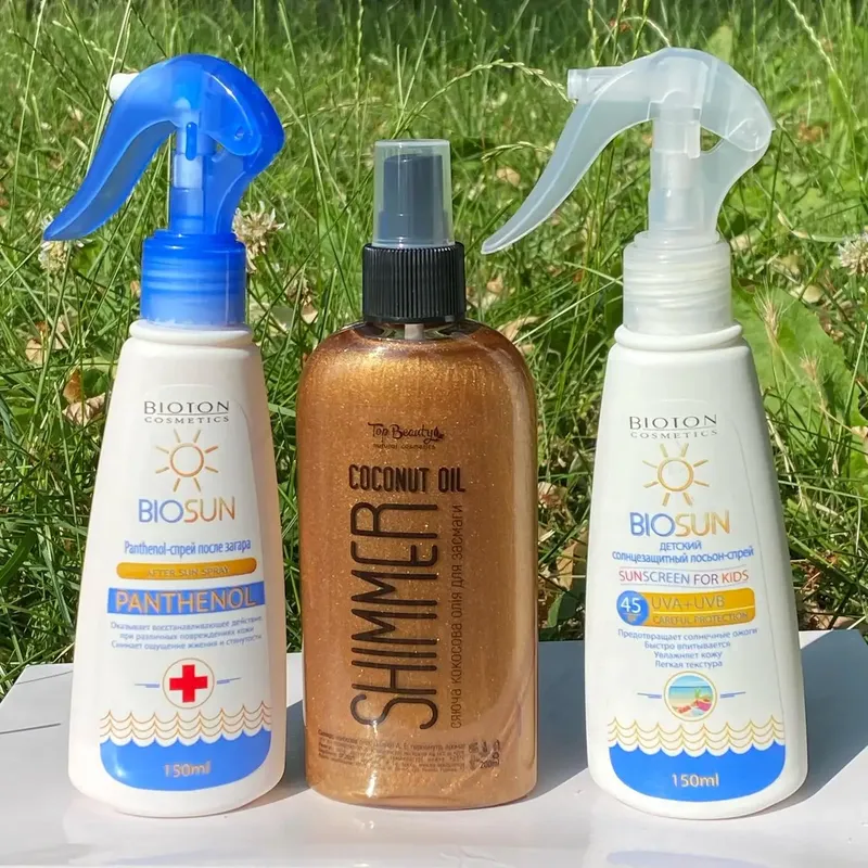 Універсальний набір для всієї родини! Він просто незамінний при активному відпочинку на сонці. Склад набору: 1. Дитячий сонцезахисний лосьйон-спрей BioSun розроблений спеціально для дитячої шкіри. Спрей володіє SPF 45, водостійкою формулою і фільтрами UVA і UVB. 2. Кокосова олія для засмаги з шиммером Top Beauty Shimmer Coconut Oil 200 мл. Шиммер - найпопулярніший продукт цього літа! Використовуючи його Ви придбаєте гарну рівну бронзову засмагу, мерехтливі частинки в складі подарують приголомшливе сяйво шкіри, і додадуть тілу стрункості. Має фактор захисту від УФ-випромінювання SPF 15 Ефект приголомшливий! 3. Пантенол-спрей після засмаги Bioton Cosmetics BioSun 150мл. Його збалансована формула розроблена на основі Д-пантенолу, персикового масла, екстракту алое і ментолу. Завдяки багатому складу засіб наповнює шкіру живильною вологою, і приємно охолоджує після перебування на сонці і купання в солоній або прісній воді. Доставка: Предоплата на карту. Доставка Новою або Укрпоштою.