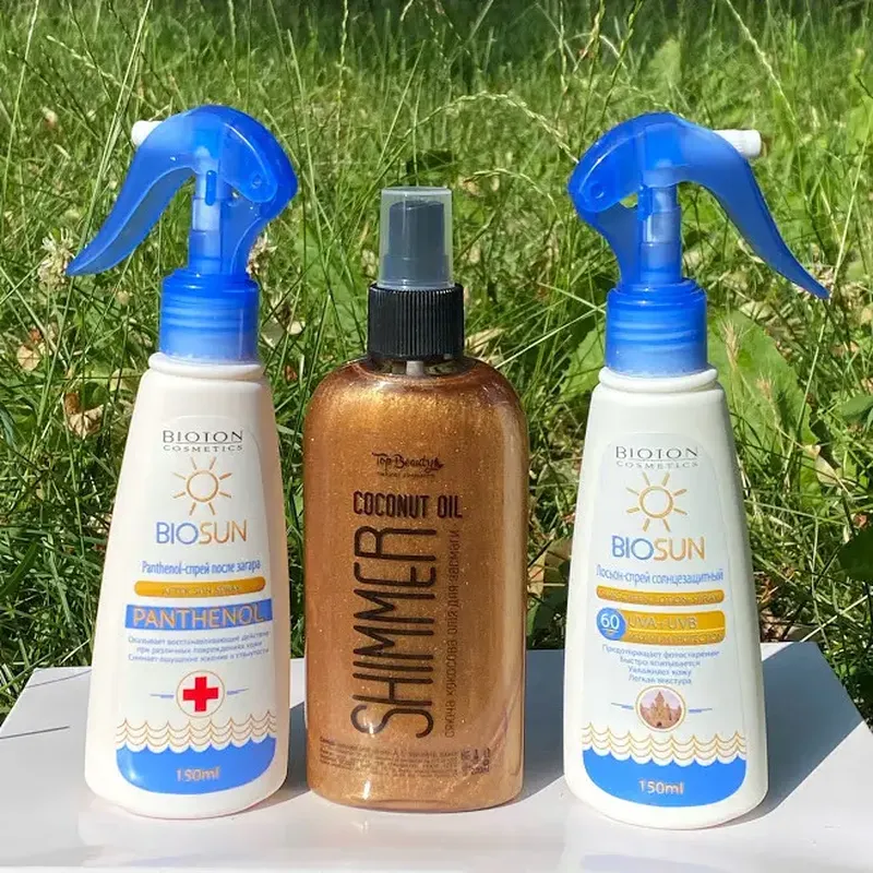 Нехай кожна ваша зустріч із сонячним промінням буде приємною та безпечною! Не забувайте про запобіжні заходи і неодмінно користуйтеся сонцезахисними засобами. А цей набір Вам у цьому допоможе. Склад набору : 1. Сонцезахисний лосьйон-спрей SPF 60 Bioton Cosmetics BioSun 150 мл. Сонцезахисний лосьйон-спрей Bioton Cosmetics BioSun володіє високою ступенем захисту SPF 60 і водостійкою формулою з фільтрами UVA і UVB. 2. Кокосова олія для засмаги з шиммером Top Beauty Shimmer Coconut Oil 200 мл. Кокосова олія для засмаги з шиммером - найпопулярніший продукт цього літа! Використовуючи його Ви придбаєте красиву рівну бронзову засмагу, мерехтливі частинки у складі подарують приголомшливе сяйво шкіри, і додадуть тілу стрункості. Має фактор захисту від УФ-випромінювання SPF15. Ефект приголомшливий! 3. Пантенол-спрей після засмаги Bioton Cosmetics BioSun 150мл. Його збалансована формула розроблена на основі Д-пантенолу, персикової олії, екстракту алое та ментолу. Завдяки багатому складу засіб наповнює шкіру живлющою вологою, і приємно охолоджує після перебування на сонці і купання в солоній або прісній воді. Доставка: Предоплата на карту. Доставка Новою або Укрпоштою.