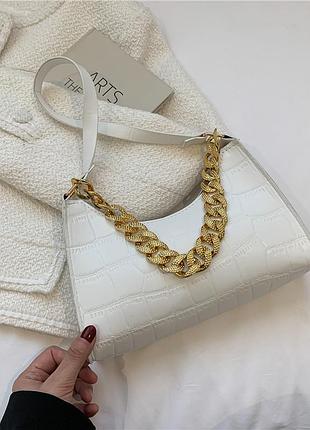 Жіноча невелика сумочка під рептилію багет крокодиляча шкіра з золотим ланцюжком бежева молочна