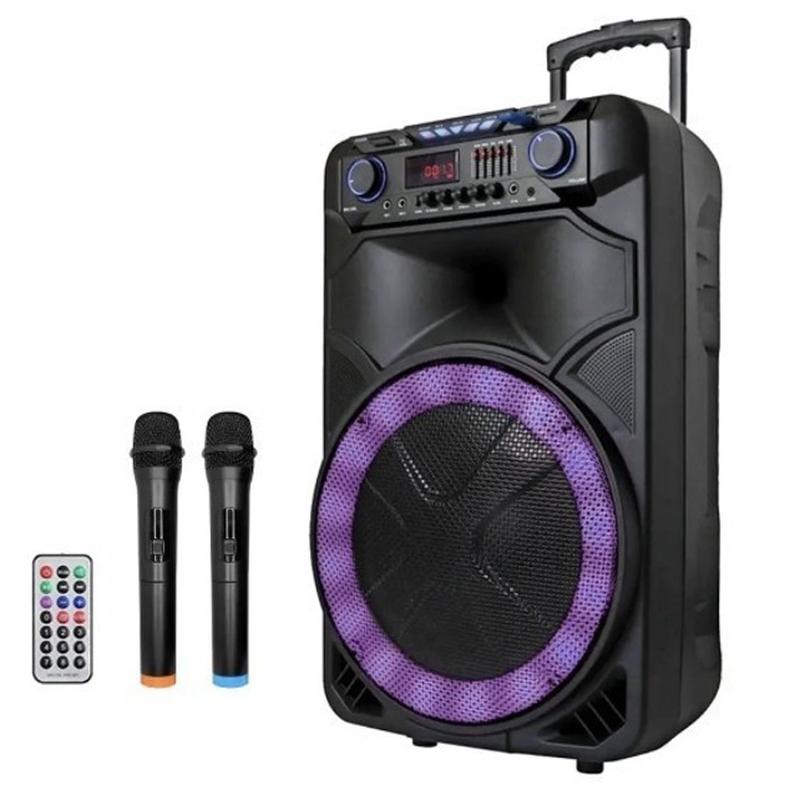 Багатофункціональна портативна аудіосистема для вечірок, концертів, виїзних реєстрацій та інших заходів. Висока якість динаміків забезпечує чистий і глибокий звук. Музичний чемодан на колесах ZXX-1011 підключається по bluetooth зі смартфоном, планшетом або ноутбуком, можливе підключення через AUX з пристроями, що володіють даним роз’ємом. USB, microSD, SD карток. На плеєрі розташовані кнопки керування відтворенням музики. Акустика виконана з високоякісних зносостійких матеріалів, а завдяки ручкам і колесам, що складаються, можна легко носити її з собою в будь-яке місце. Є вхід під акустичну стійку 5-ти смуговий еквалайзер Висувна рукоять зверху. Можливість запису вашого співу на флешку через USB вхід. Індикація заряду акустики. Характеристики акустики: Номінальна потужність: 800 Вт Пікова потужність RMS: 200 Вт Опір: 4 Ом АКБ 12 вольт 7 Ah Еквалайзер на пульті керування : Rock/Pop/Jazz/Clasic/ Динаміки: Динамік Низьких Частот – 1х15″ (дюйми) Днамік Високих Частот (твіттер) – 1х3 “(дюйма) Частота: 50 Гц – 20 кГц Чутливість: 95 +/- 3 дБ FM-радіо : Так Bluetooth: Так USB вхід: Так SD card вхід: Так FM радіо: Так (88-108 mHz) Радіомікрофон: 2 шт (Працює в радіусі 50 метрів від колонки) Напруга живлення: 110-240V Вбудований акумулятор: Так (Робота акустики до 10 годин без підзарядки) Можливість підключення додаткового джерела живлення на 12 вольт. Вага в упаковці: 13 кг Розмір коробки: 82х48х42 Три види живлення акустики(регулюється перемикачем на акустиці): Від вбудованого акумулятора. Від мережі 220V (від розетки). Від припливу 12V (тобто від додаткового акумулятора) Регулювання керування гучністю акустики: Управління гучності акустики: Загальне регулювання гучності акустики. Регулювання TREBLE (високі частоти) для мікрофонів. Регулювання BASS (низькі частоти) для мікрофонів. Керування гучністю мікрофонів: Загальне регулювання гучності мікрофонів. Налаштування ECHO для мікрофона. Функція пріоритету мікрофону над музикою. (Mic. priority) Керування гучністю гітари: Загальне регулювання гучності гітари. Вхід для підключення: USB вхід. SD/MMC Card вхід. Аудіо вхід (Audio input)/ для підключення ноутбука та інших пристроїв. Мікрофонний вхід: 2 шт х Jack 6.3″. Гітарний вхід: 1 шт х Jack 6.3′. AUX 12V вхід для підключення додаткового живлення акустики. Комплектація: АкустикаZXX-1011; Радіомікрофон – 2 шт; Пульт керування – 1 шт; Шнур живлення та заряджання; Кабель; Інструкція; Упаковка.
