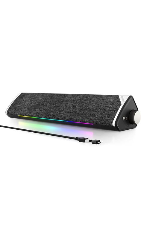 Динаміки для комп’ютерів SOULION R60 Bluetooth, динаміки для ПК USB Plug-N- Play зі світлодіодним динамічним світлом, - 【5 DYNAMIC LIGHT MODES】З 5 барвистими світлодіодними світловими ефектами, які можна перемикати в один клік. Також увімкнути/вимкнути світло можна за допомогою кнопки керування. За допомогою цих вогнів, щоб покращити атмосферу прослуховування музики, перегляду фільмів та ігор - 【USB PLUG & PLAY】Просто підключіть USB-порт для живлення та звуку. Натисніть кнопку "M" в режим ПК, щоб запустити і контролювати гучність +/- з поворотною кнопкою на динаміках комп'ютера - 【BLUETOOTH MODE】 Вбудована технологія V5.3 Bluetooth дозволяє динаміку підключати мобільний телефон, планшет, ПК через Bluetooth, зручніше відтворення. Натисніть перемикач кнопки "M" в режим bluetooth, а потім пошук "R60" на смартфоні/планшеті для підключення - 【STEREO & CLEAR SOUND】Діапазон частот 20 Гц - 20 КГ Комп’ютерні динаміки SOULION можуть забезпечувати чіткий і гучний звук, створюючи захоплюючий звуковий ефект і покращуючи ваше прослуховування, насолоджуючись фільмами, відео, музикою та іграми в приміщенні - 【ПРОСТИЙ У ВИКОРИСТАННІ】Ротаційна ручка для ввімкнення/вимкнення живлення та гучності +/-. Кнопка освітлення одним натисканням, щоб увімкнути/вимкнути або змінити режими освітлення. Натисніть кнопку “M”, щоб змінити режим PC/Bluetooth/AUX (ПРИМІТКА: 3, 5 мм AUX кабель не входить). Довге натискання на 3s, щоб очистити пам'ять bluetooth - 【WIDE COMPATIBILITY】Сумісний з ПК, комп’ютером, ноутбуком, смартфонами та планшетом. Він може підключатися до USB, також оснащений адаптером USB C-USB, завдяки чому динамік добре працює лише з портом Type-C, такими як Macbook Air Pro, смартфони чи інші пристрої