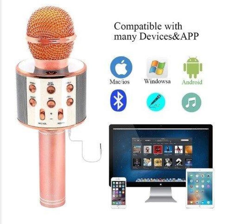Портативный беспроводной микрофон-караоке, который удобно носить с собой WS-858Технология Bluetooth снижает потребление энергии, обеспечивает стабильное соединение и быстрее передает сигнал, эффективная дальность действия беспроводной связи до 10 метров.Подходит для поездок, пикников, вечеринок, семейных развлечений, пения в караоке и т.д.Совместим с большинством мобильных телефонов и планшетов.Особенности:Bluetooth беспроводной микрофон и колонки, два в одном.Головка микрофона имеет три обработки уменьшения шумов, что подчеркнет ваш красивый голос. Есть режим – ЭХО.Батареи емкостью 1800mAh хватает до 6 часов непрерывного пения.Подходит для IOS и андроид смартфонов, для планшетов, Bluetooth и так далее.Может быть использован в качестве Bluetooth динамиков.Есть функция записи на карту памяти microSD. Характеристики:Модель: WS-858Bluetooth 4.1Интерфейс: 3.5 мм, USB 2.0Материал: алюминий+ABSЦвет: черныйЧувствительность: -40 ± 3 дБМикрофонные полярные узоры: КардиодаТип аккумулятора: Li-IonЕмкость: 1800 mAhВыходная мощность: 5WЧастотный диапазон: 100Hz 10кГцМаксимальный уровень звукового давления: 115 дБ 1 кГцСуммарный коэффициент гармонических искажений: до 1%Вес: 391 гКомплектация:Микрофон WS-858USB кабельмикро USB аудио кабельинструкция по эксплуатации